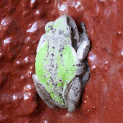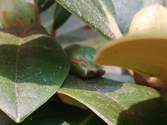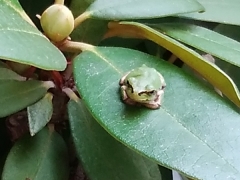 | 久しぶりにまたカエルが戻ってきた。物干し台のポールの中でなく、シャクナゲの葉の上に3匹それもまだ小さい子供のカエルである。かわいらしかったので写真に収める。この日は暖かい日であった。18日までどこかへ出かけたり戻ったりしていた。暑い日は、日陰のシャクナゲの葉の上で休んでいた。毎日暑い日が続きそれ以降カエルを見ることはない。(08/08) |