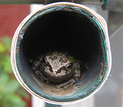 | もうそろそろ帰ってくるだろうと先日から我が家の物干し台のポールの中を毎日覗き込むが昨日までは居なかったが、今朝覗き込むといつもとは違うもう一方の方に、こちらを向いたカエルと顔を合わせた。嬉しかった。帰ってきてくれてありがとう。これからも毎日観察するのが楽しみである。こちらのポールは怪我をして昨年10月3日に「さよなら」と言って出て行ったきりだったが、そのカエルが戻ってきたのかは、まだ確認することはできない。 |